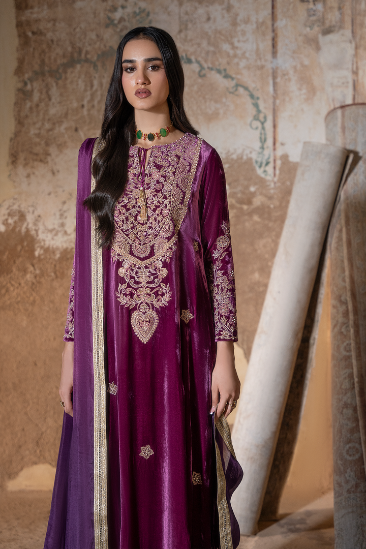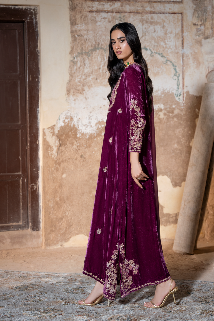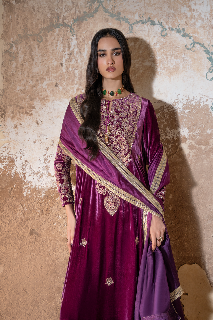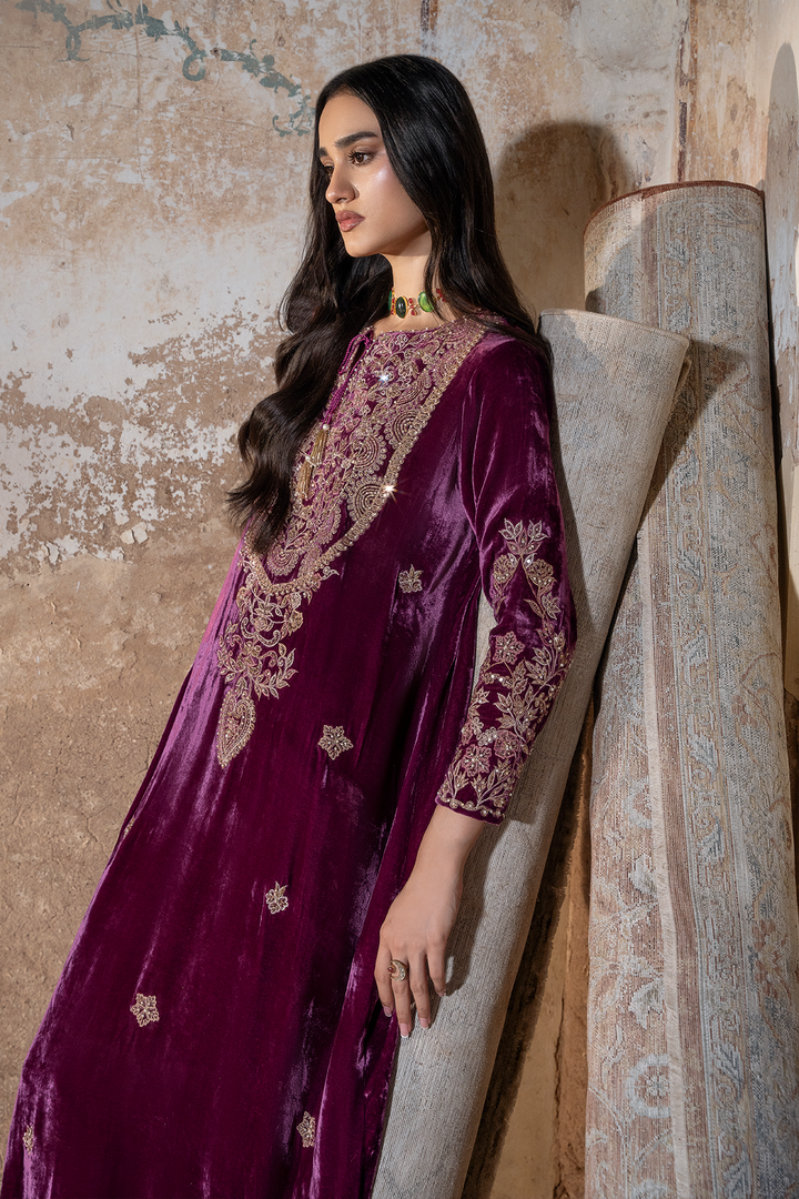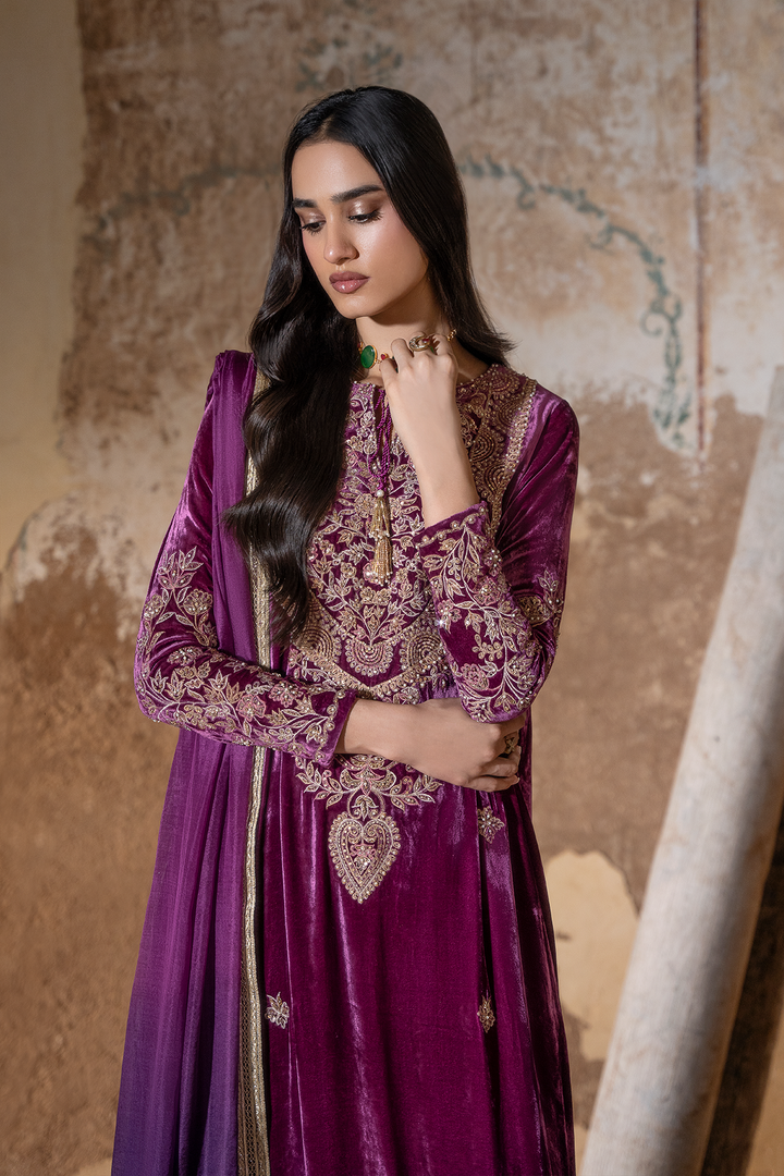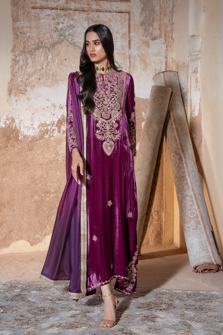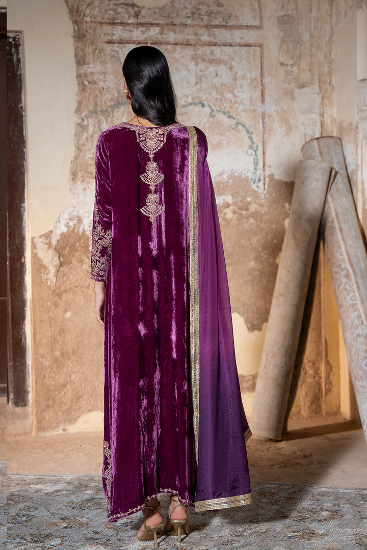 Envelop yourself in the grace of our mauve pink velvet kaftan. Featuring intricate tilla and Resham work, it's a true statement piece. Adorned with hand-done embellishments and crystals on the daman and back as well