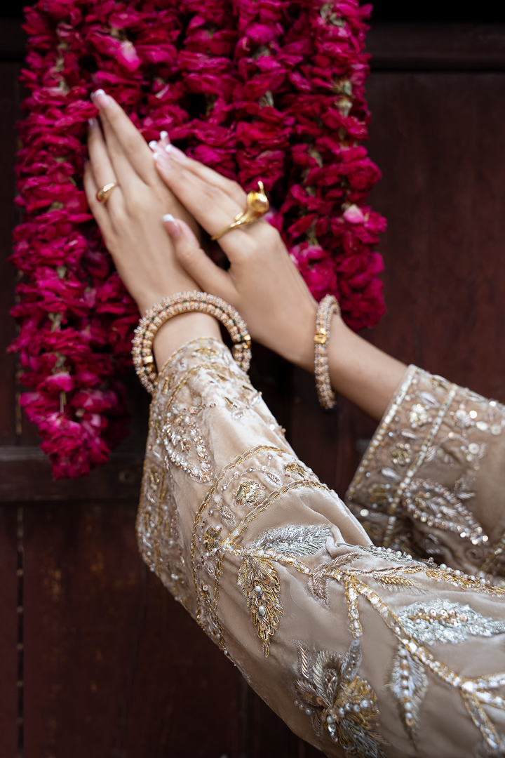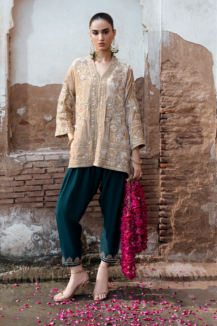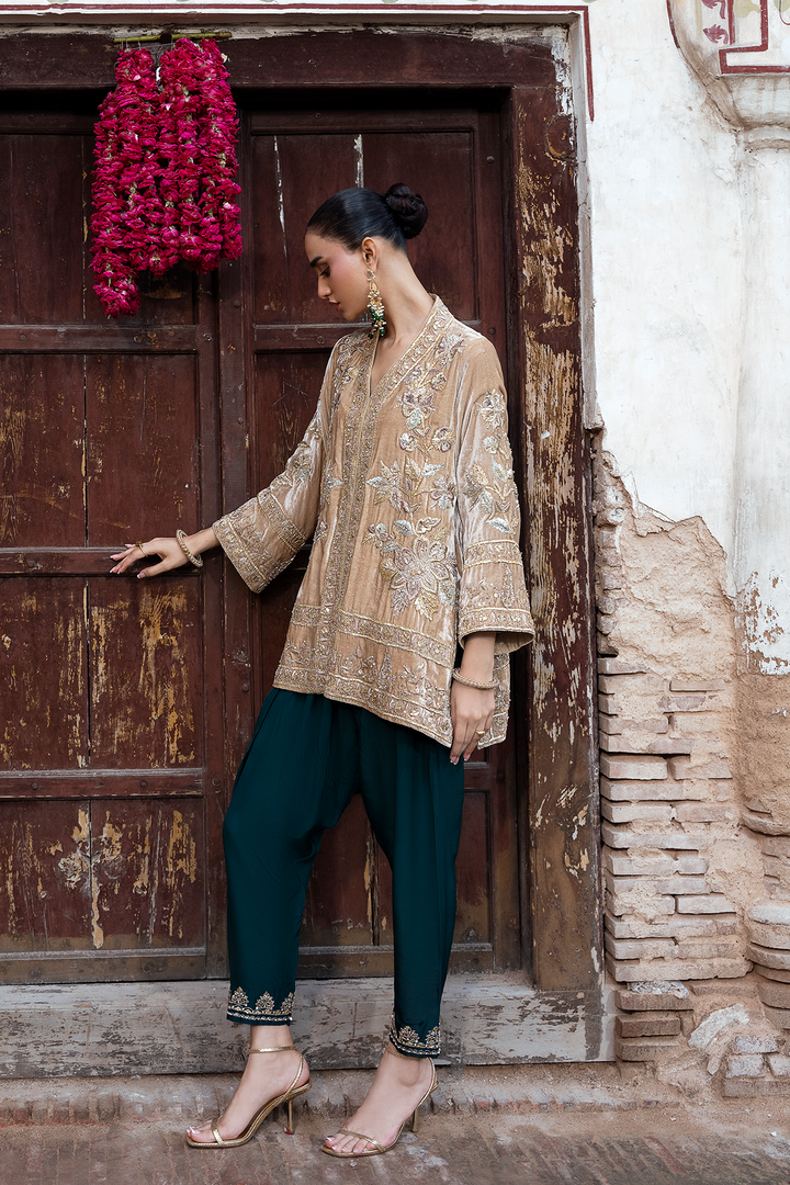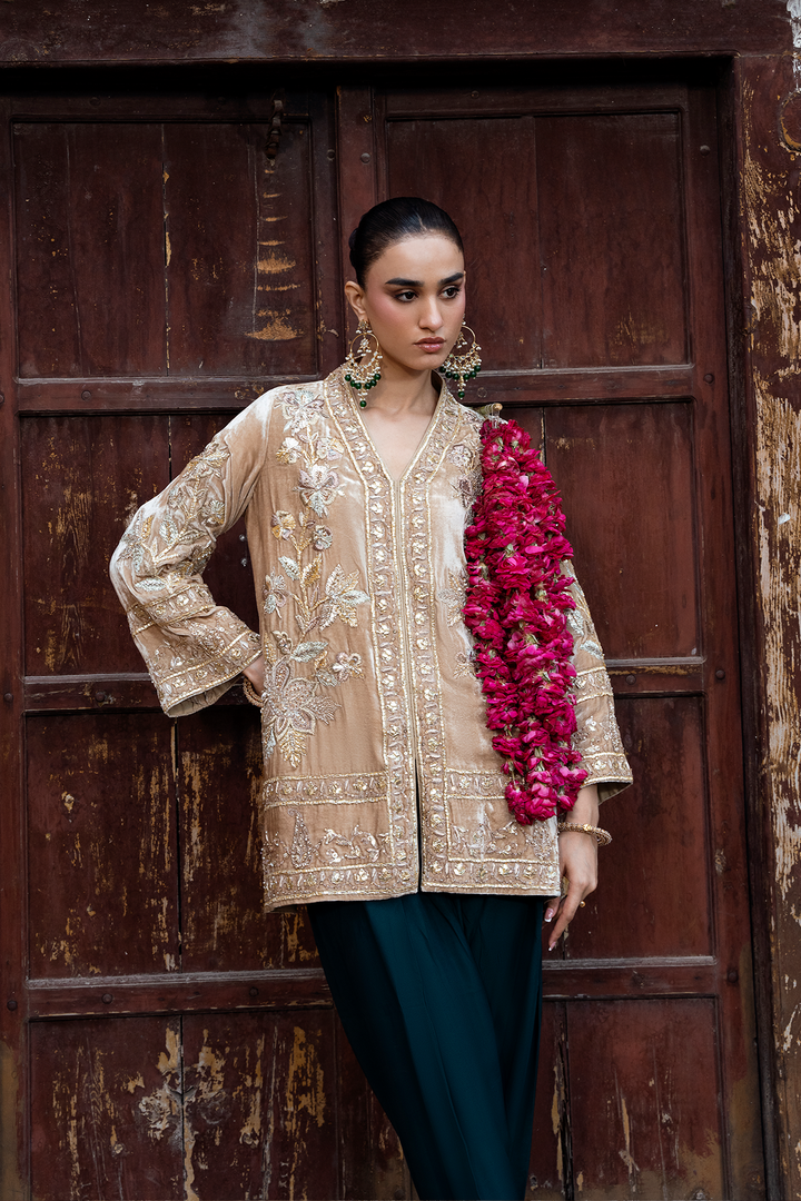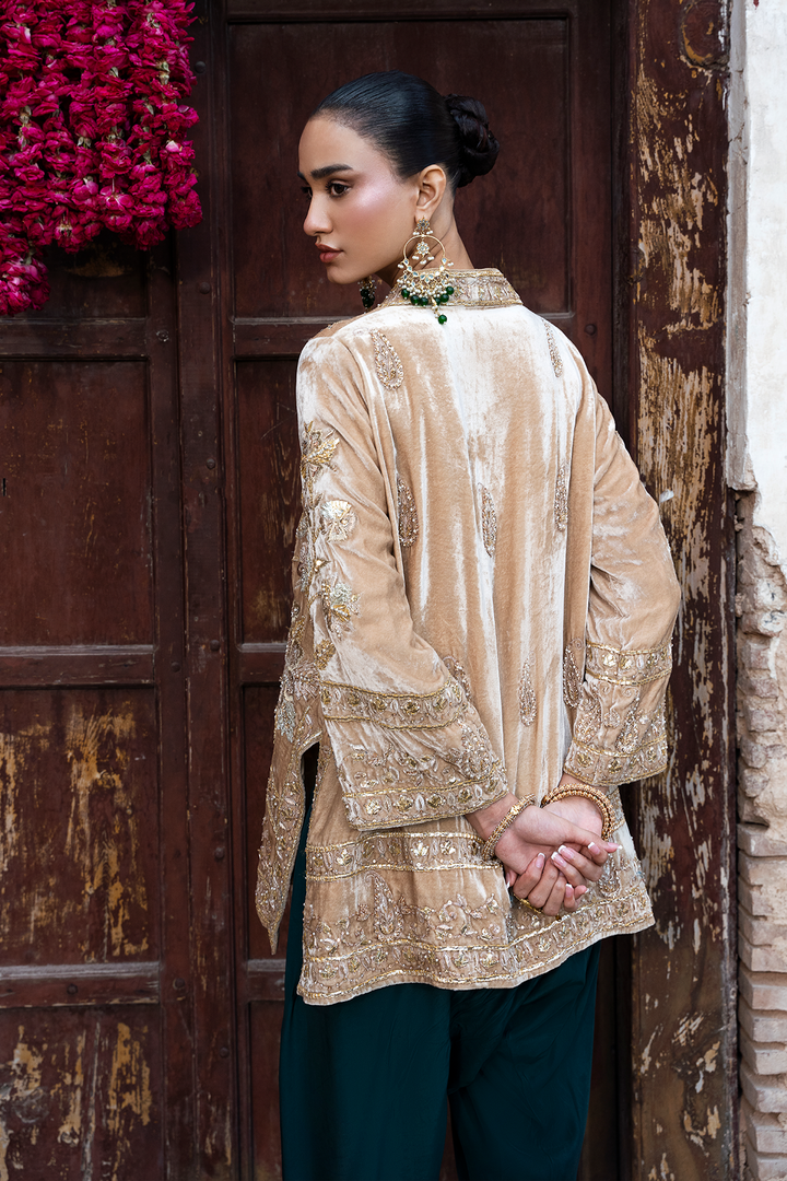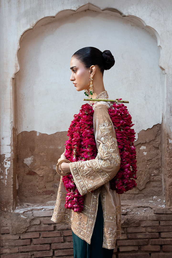Wrap yourself in luxury with our pure French gold velvet jacket. Adorned with intricate Gota Patti work and hand-placed embellishments, it's a masterpiece. Make a statement with timeless elegance.