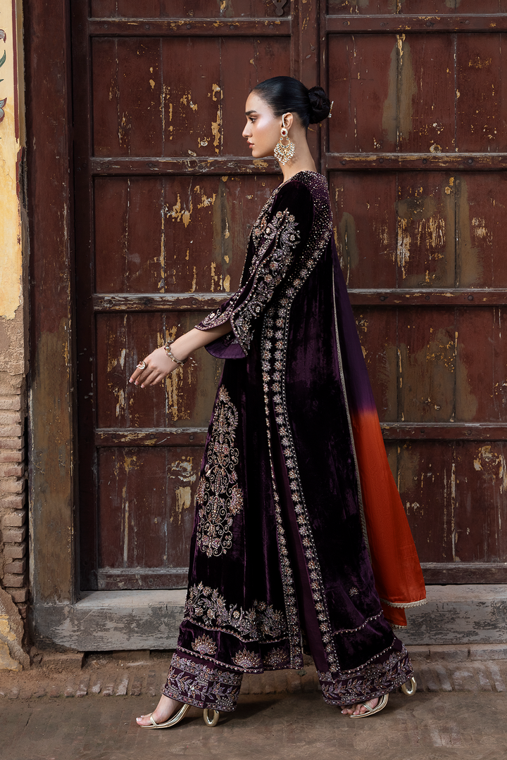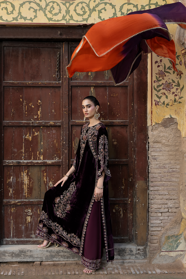 Experience opulent sophistication with our velvet shirt. Showcasing tilla, Resham, and crystal work and a mix of hand done embellishments , it's a luxurious ensemble. Complemented by intricately designed culottes for a refined, evening look