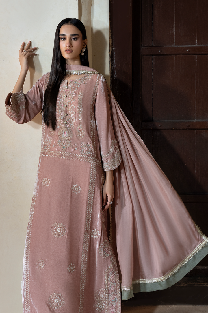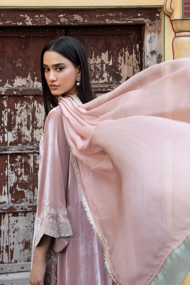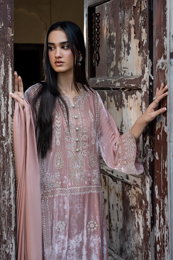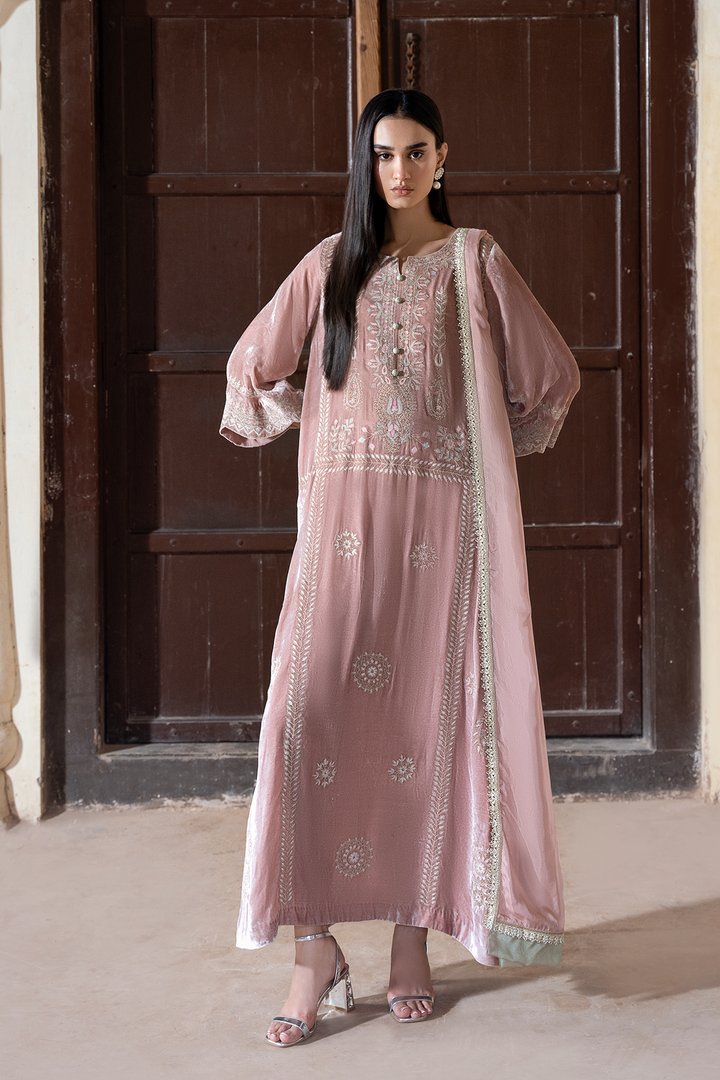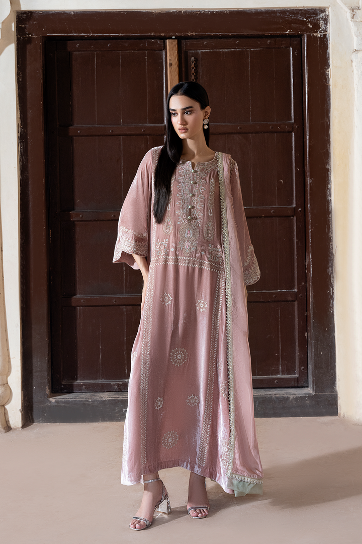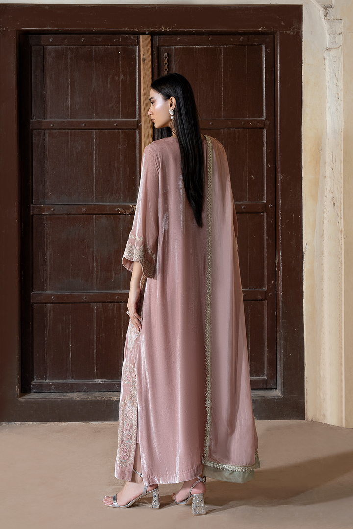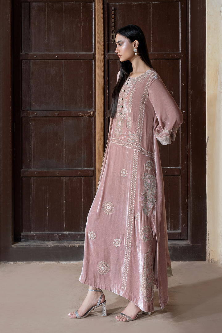 Discover the allure of our velvet nude pink kaftan, exquisitely embroidered. Featuring intricate aari style detailing, it's a statement piece. Experience luxury and artistry in every stitch.